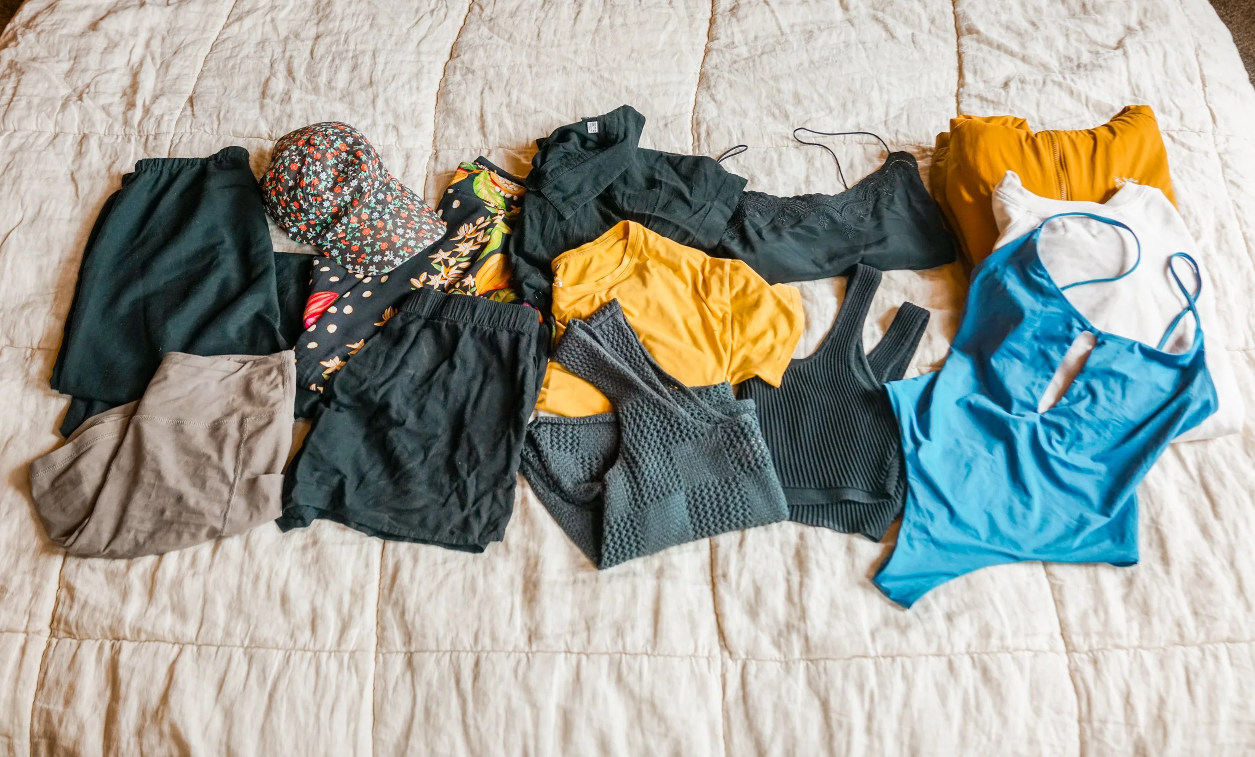 1 pair of active shorts or leggings: My preference is a pair of yoga shorts with pockets (which is better for hiking than those without) but might opt for leggings if my destination is on the cooler side. Mate the Label and Athleta are two brands I like for active shorts. If you go for a darker color, yoga shorts can also be styled for streetwear.