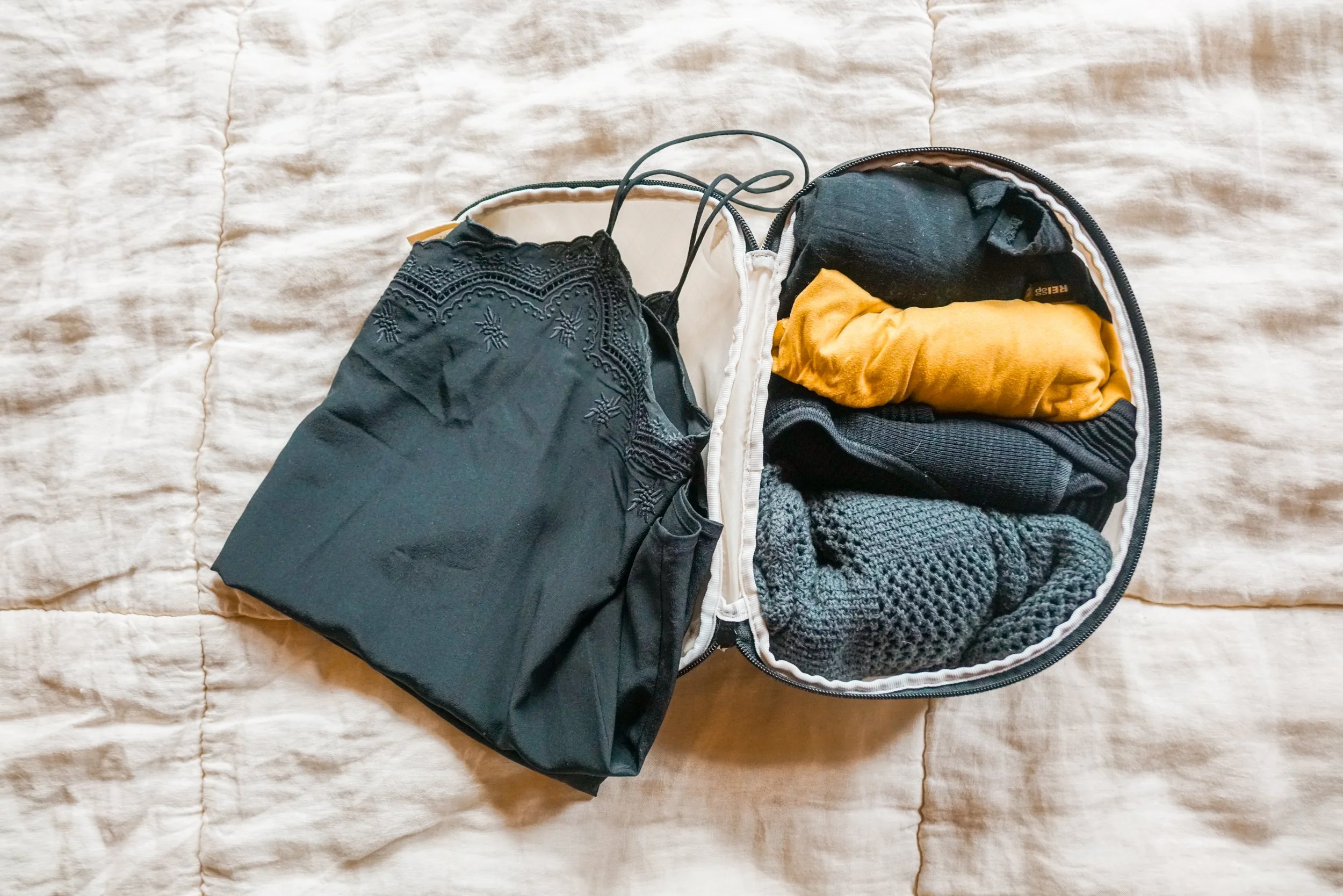 Bring 1-2 bathing suits and a lightweight cover up. I usually don’t pack a dedicated cover up, though, since my short + shirt set from Rhytmn works really well as one and dries quiclkly. I like packing these in a dedicated wet bag — just in case you take one last dip before your flight and your suit is still a little damp when you’re packing up.